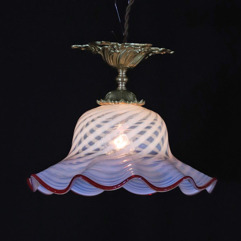 ひらひらとした外見のガラスシェード素材はオパールセントガラスで、縁取りにはルビーガラスを使用。