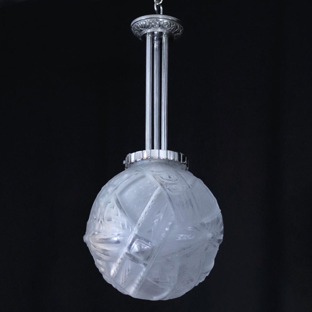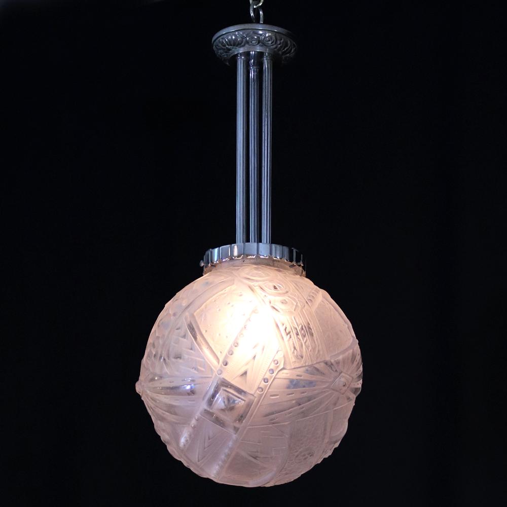 アール・デコデザインのフロストガラスシェードと銀色のメッキを施したブロンズフレームの組合せです。