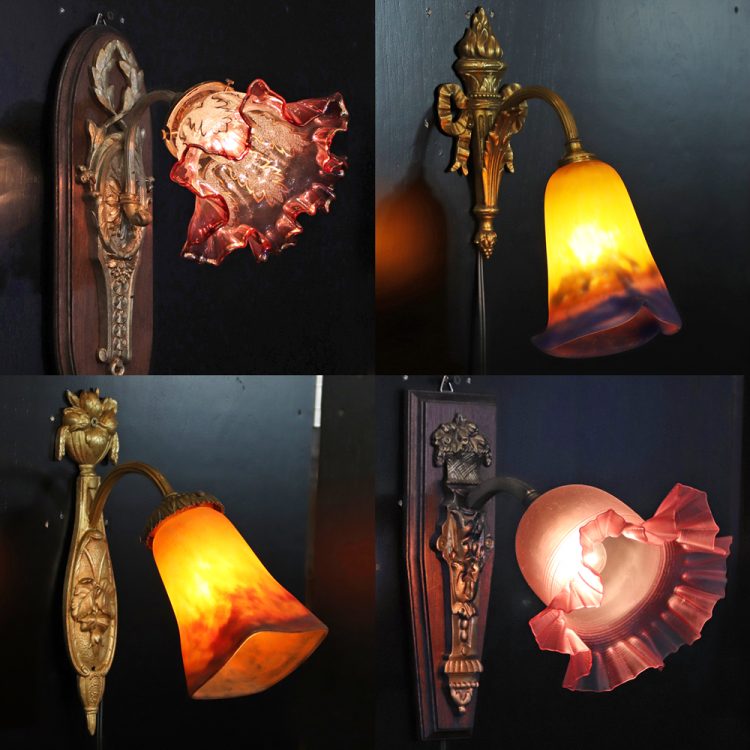 - 左上:フランス アンティーク 金彩クランベリーガラスシェード ブロンズ ウォールランプ ¥ 132,000(税込)