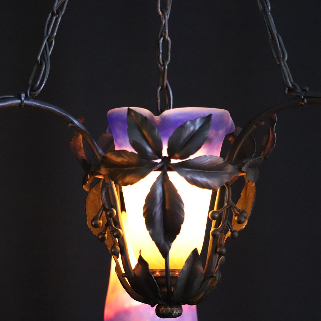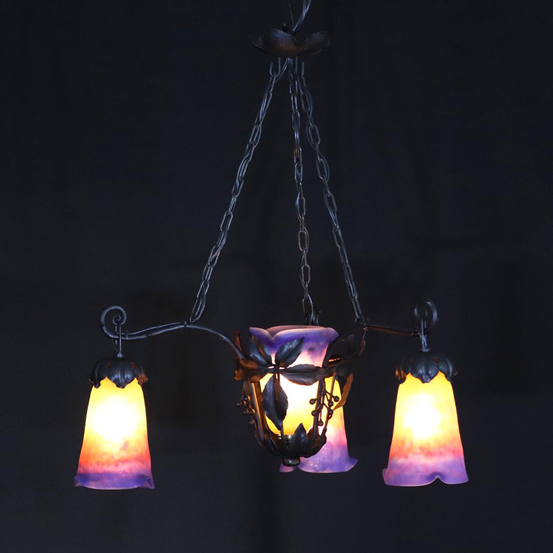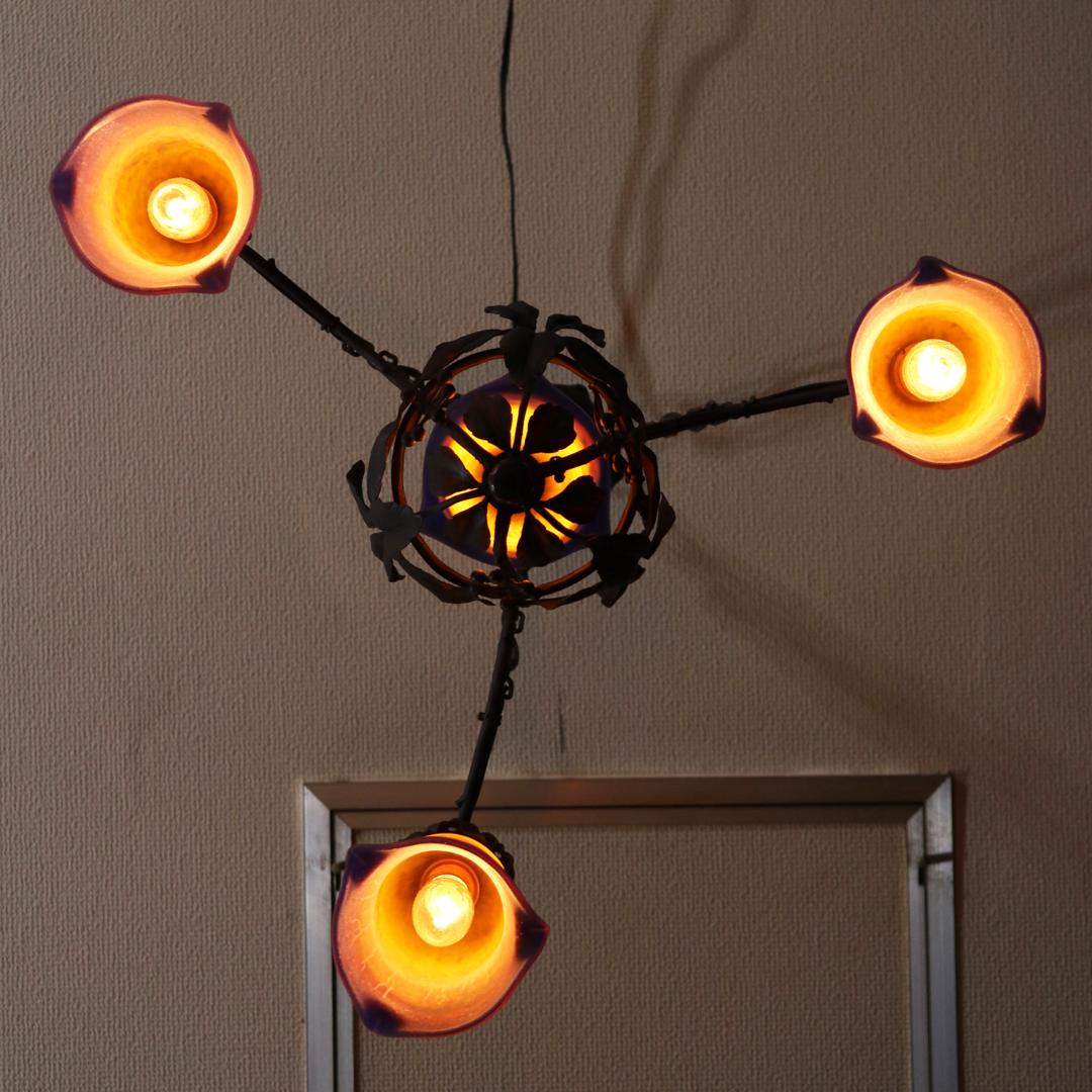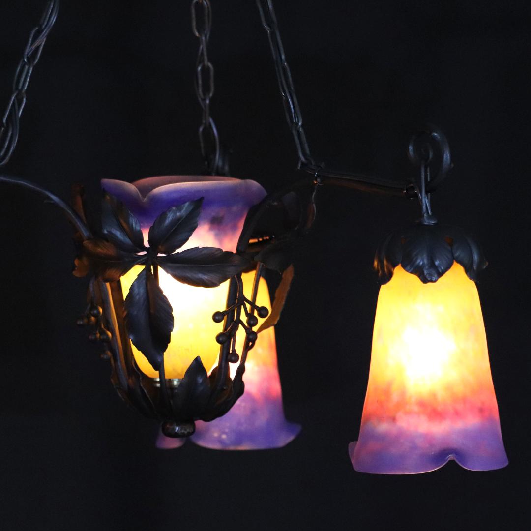 20世紀初頭、南フランスのガラス工房ミューラーが製作したガラスシェードと鍛鉄製シャンデリアの組合せ。