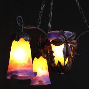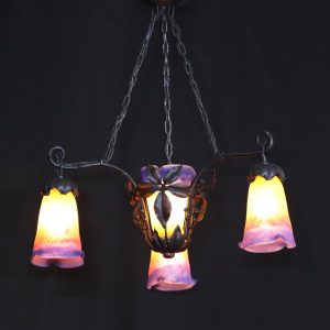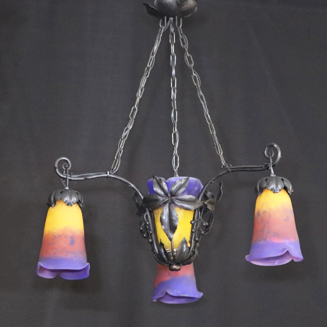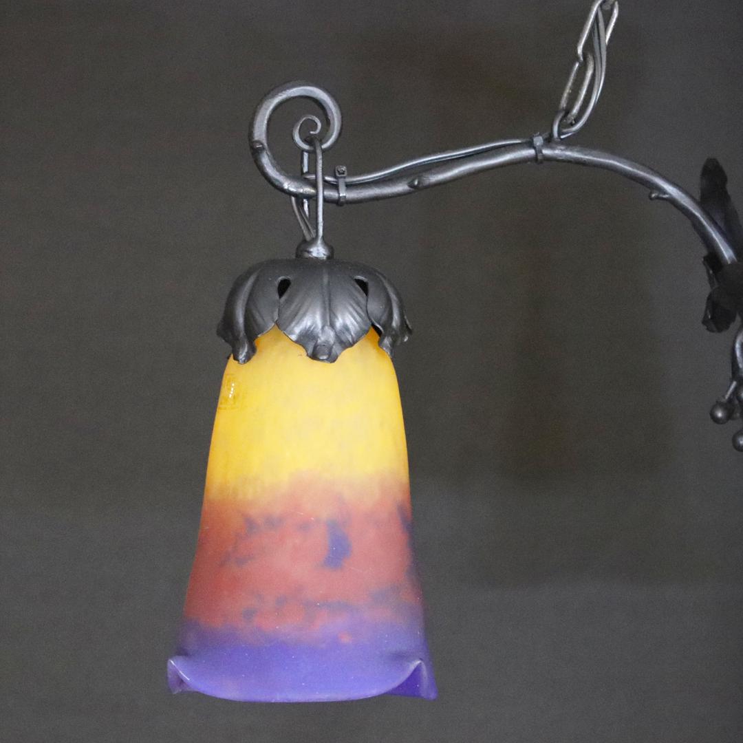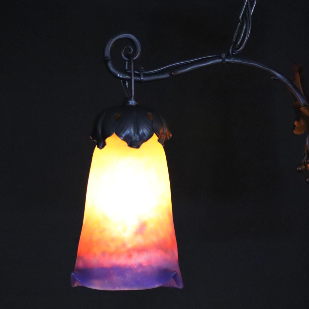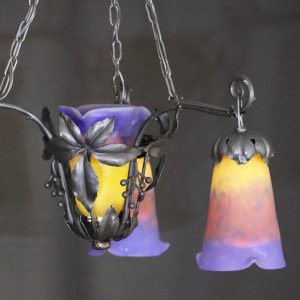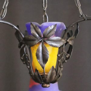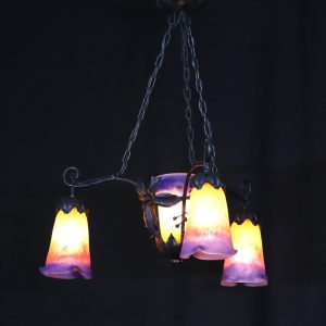 20世紀初頭、南フランスのガラス工房ミューラーが製作したガラスシェードと鍛鉄製シャンデリアの組合せ。