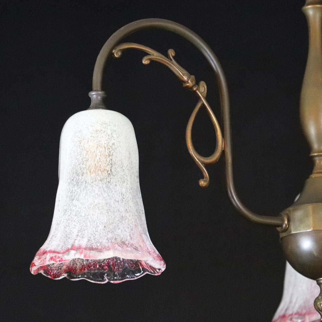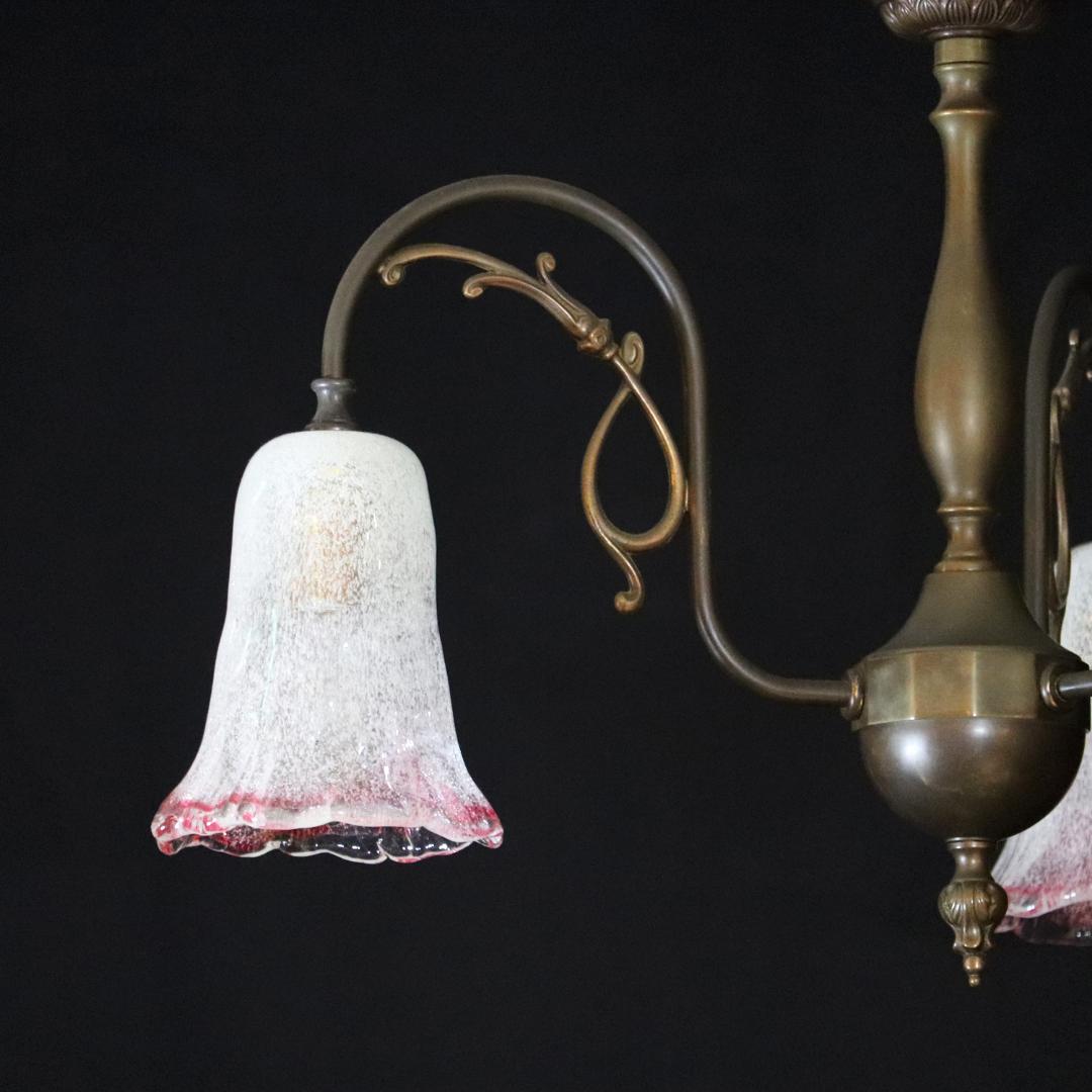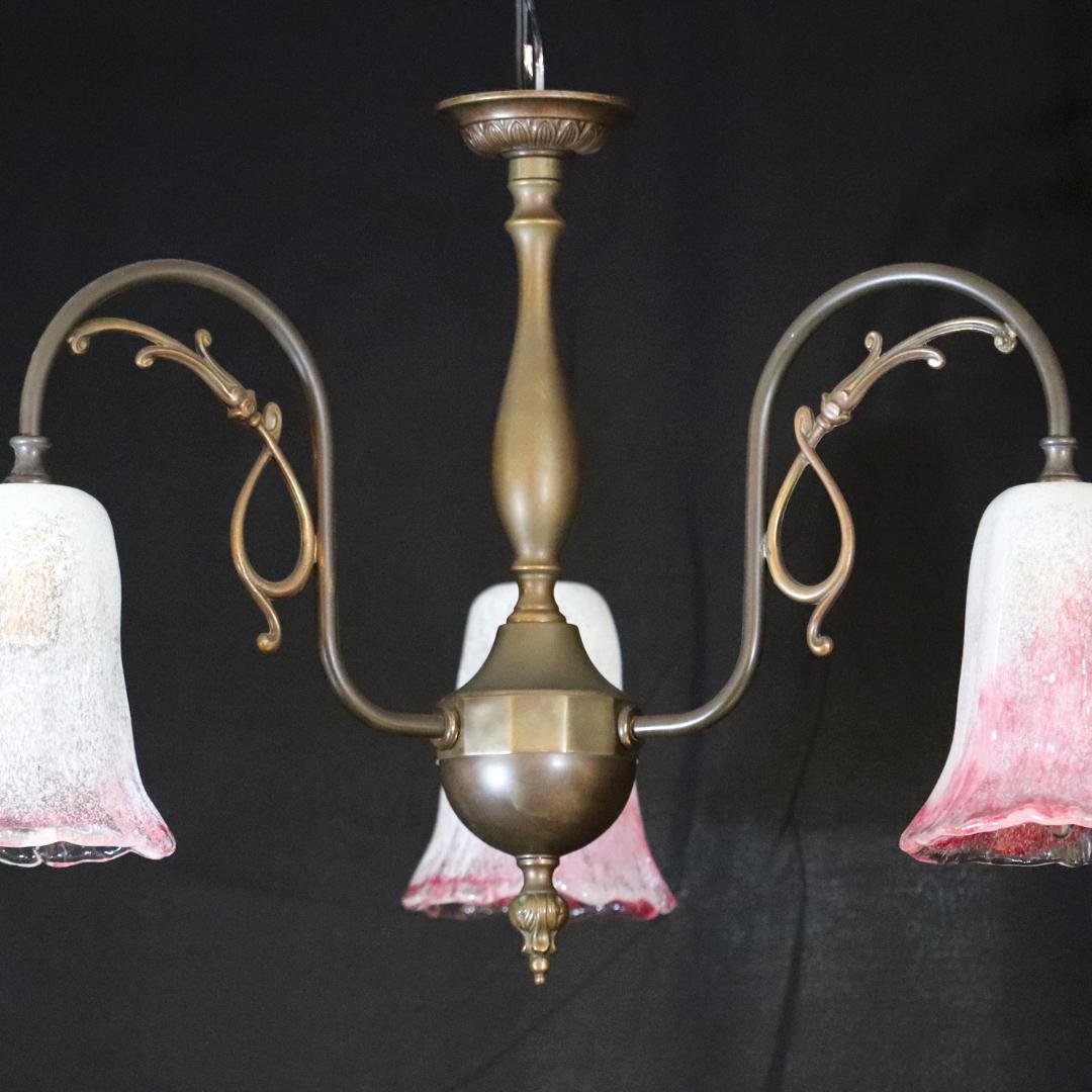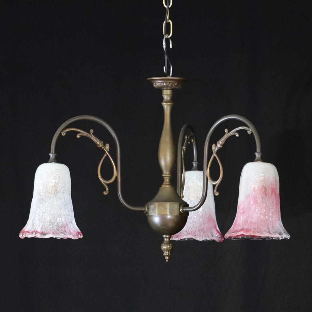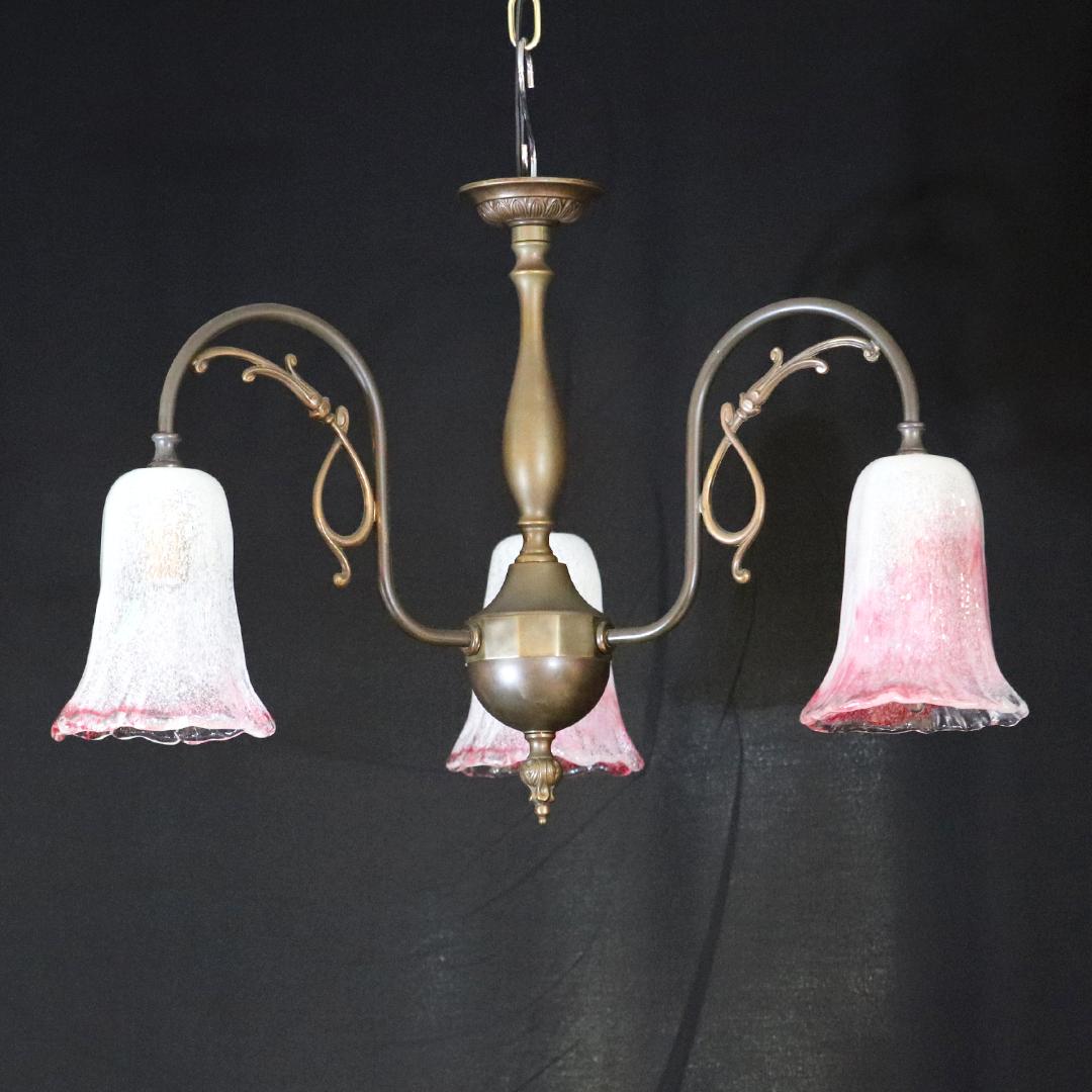 日本 岩田硝子シェード & イタリア アールヌーヴォースタイル ブラス 3灯シャンデリア