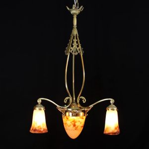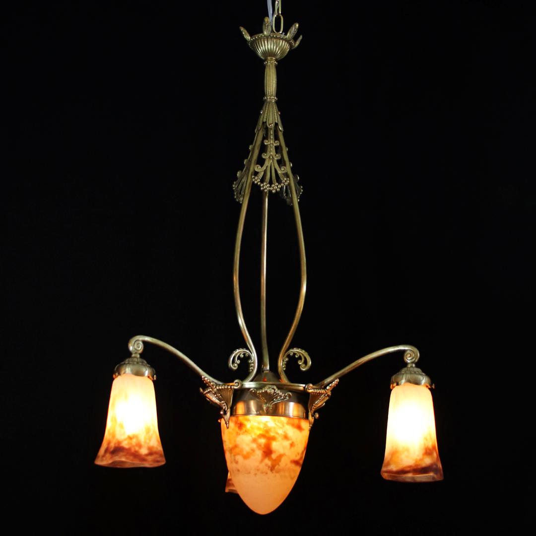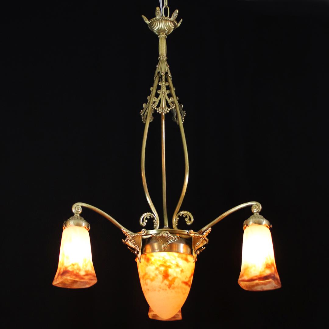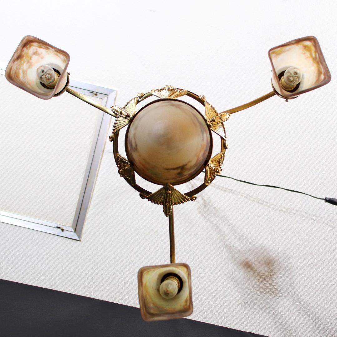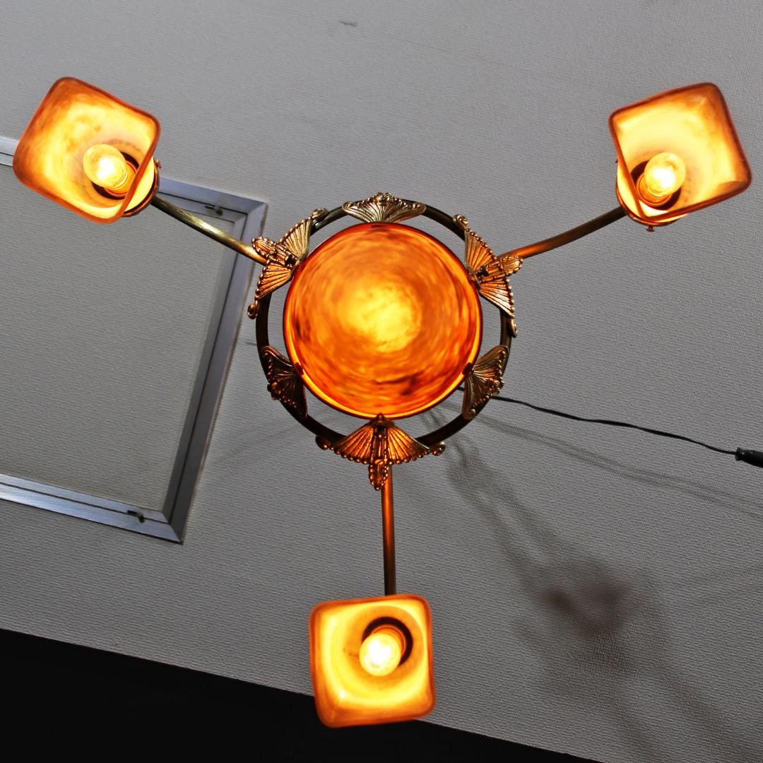 フランス アールデコ ミューラー 接骨木文 ブラス4灯シャンデリア