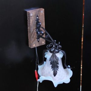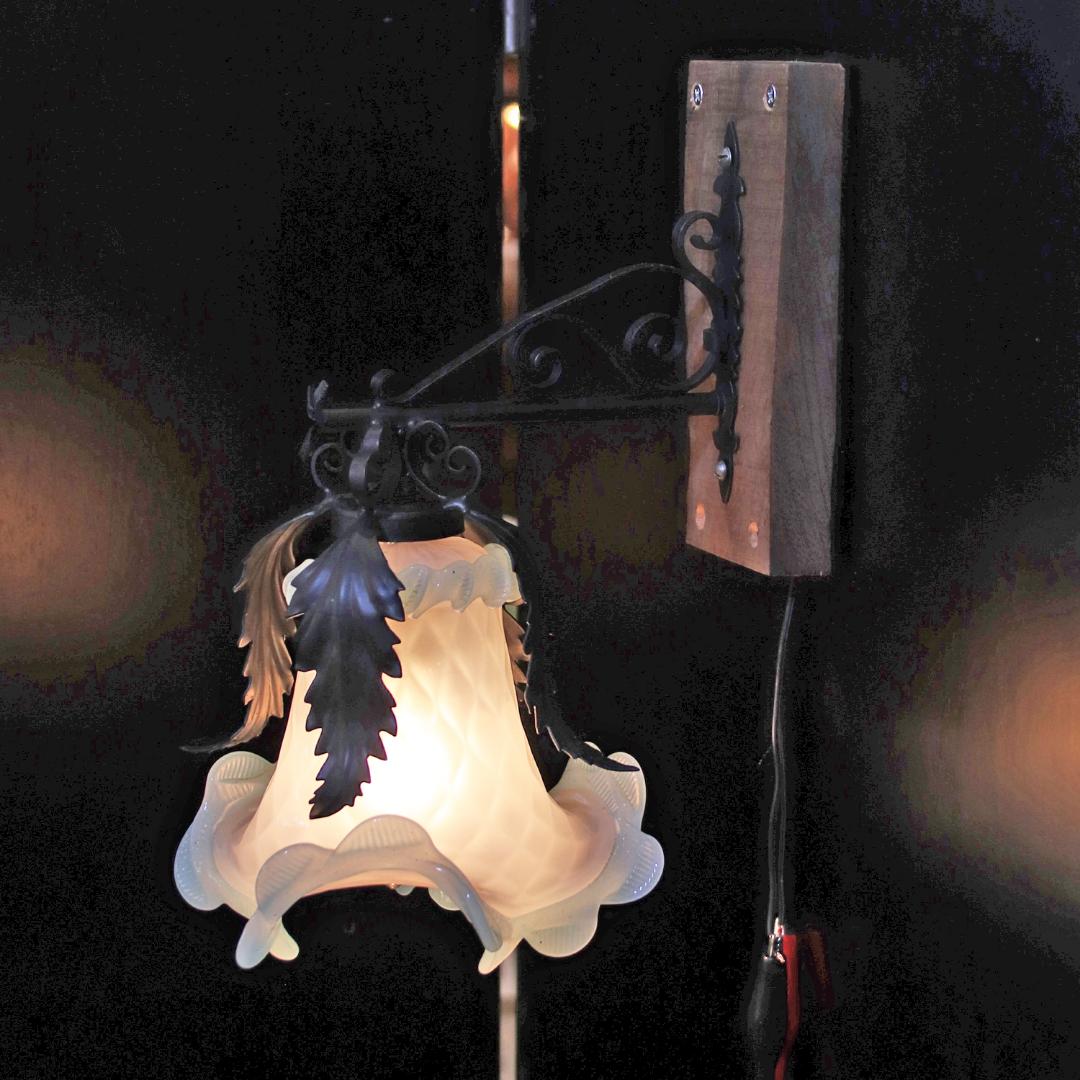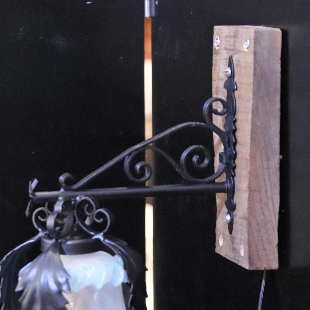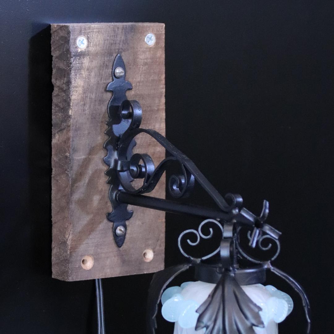 ブラケットの台座に古材を使用したアイアンウォールランプ。