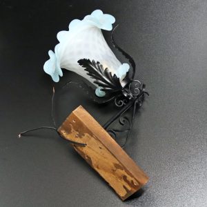 葉の形をしたアイアンパーツがシェードを抱えるデザインになっており、これによってシェードとブラケットが固定されています。
