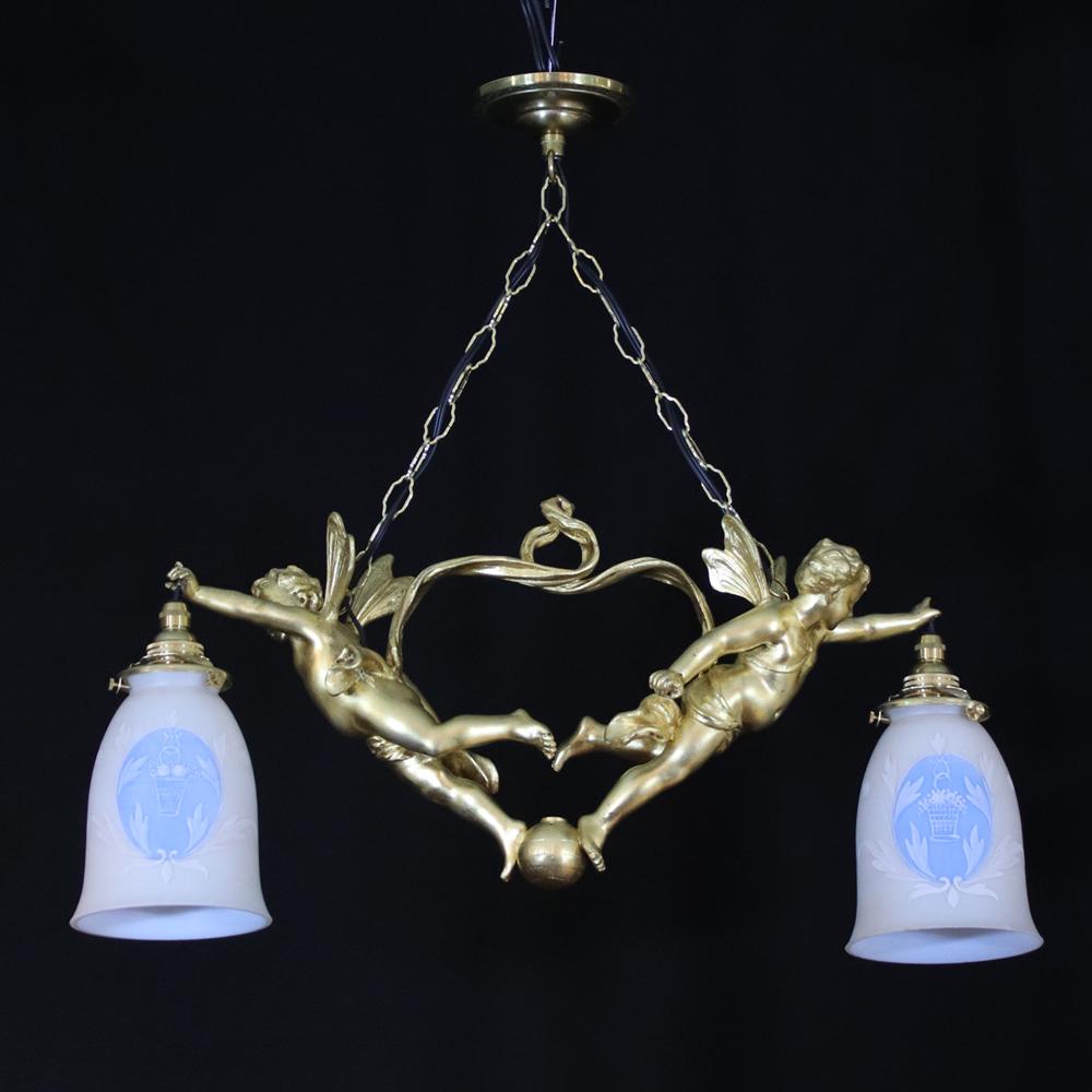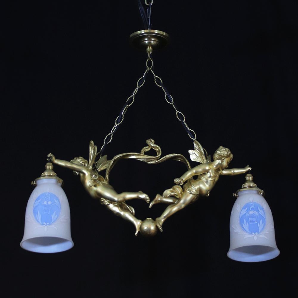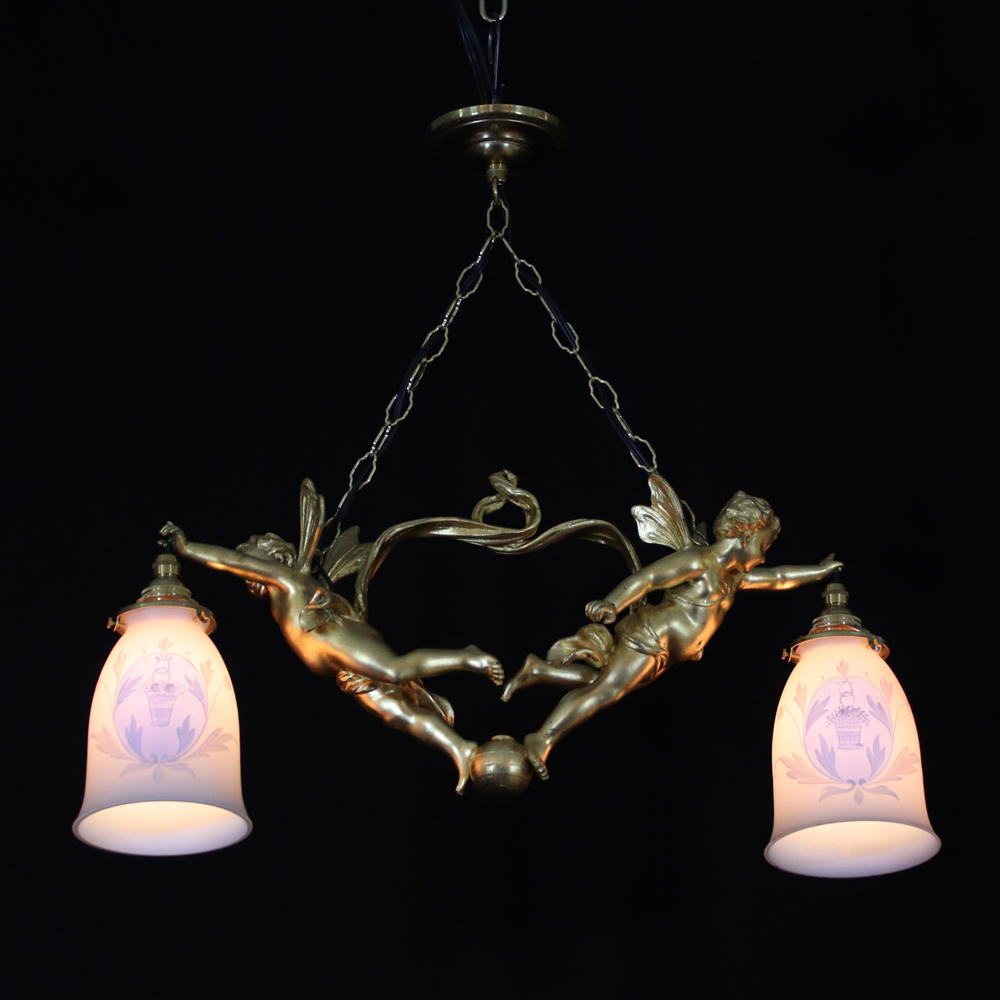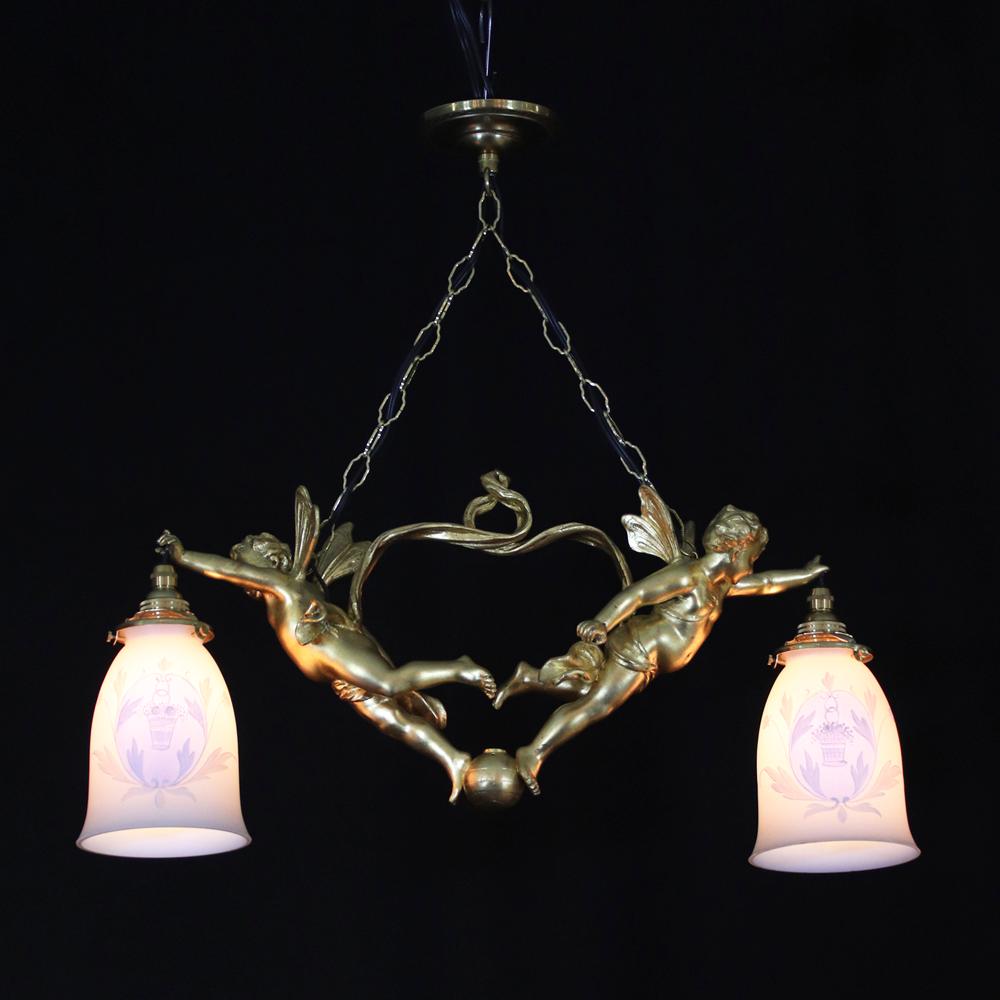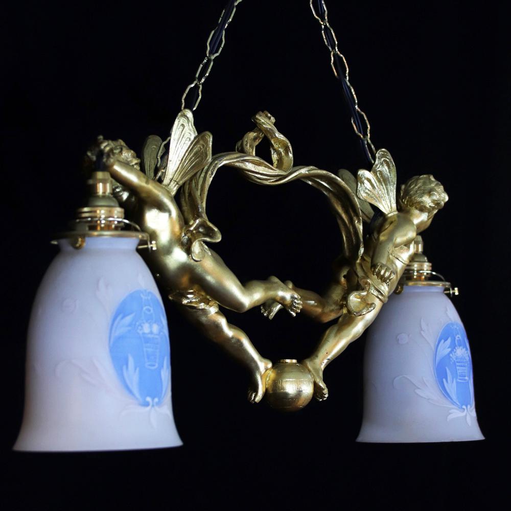 二十世紀初頭 ミルクガラス&本金仕上げブロンズ 2灯 フィギュラルシャンデリア