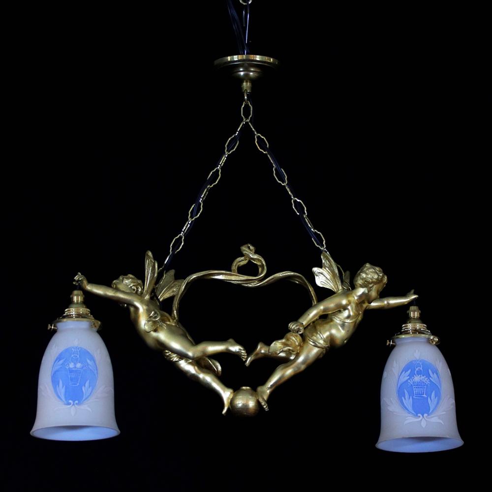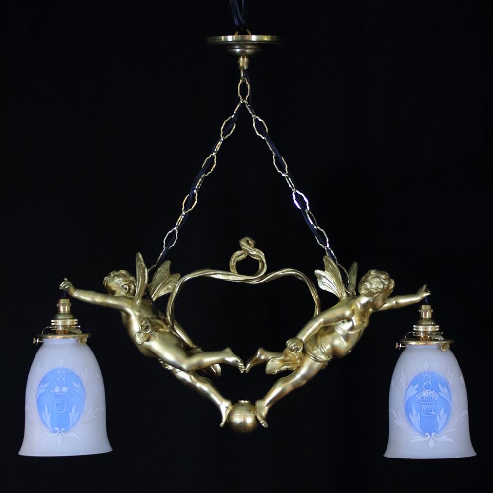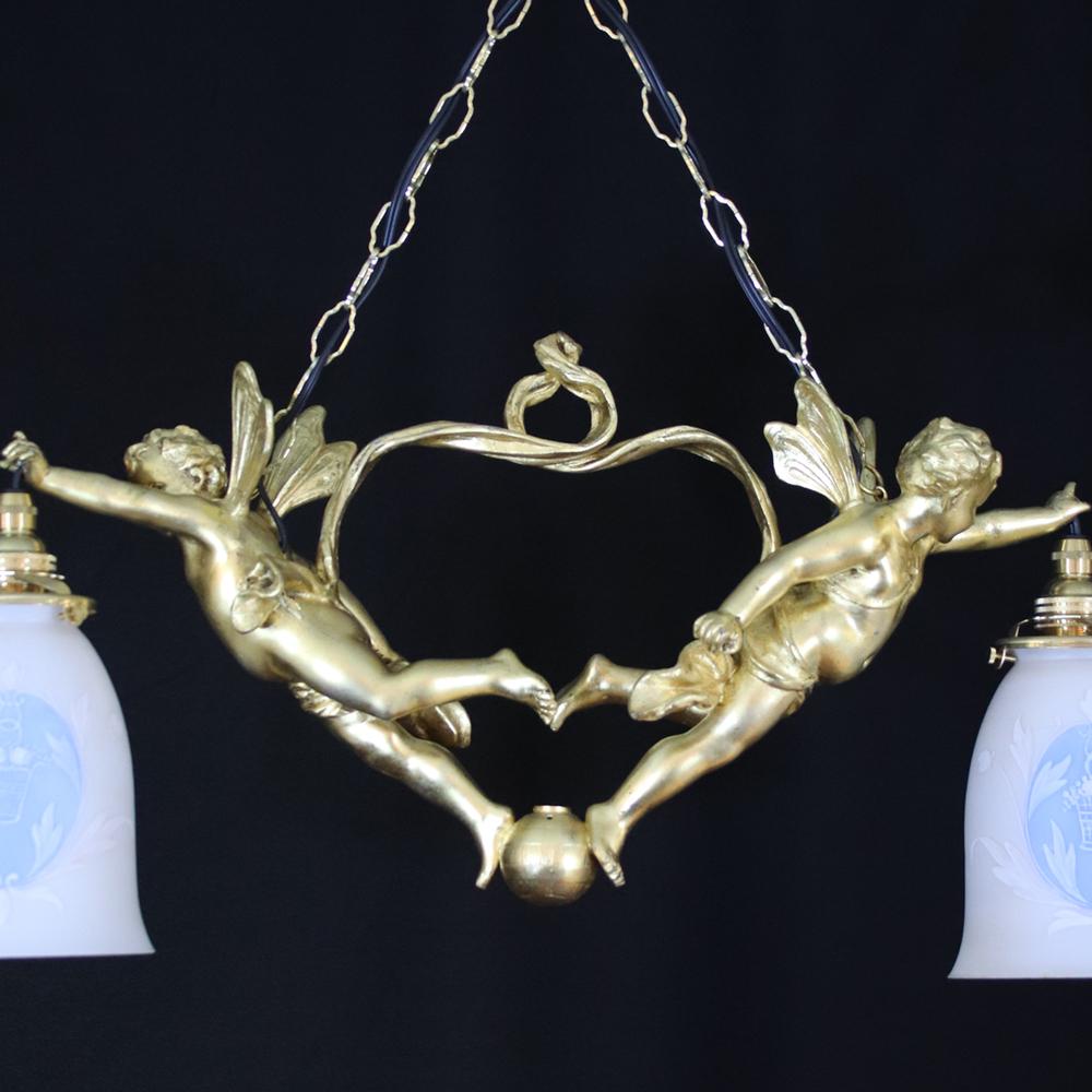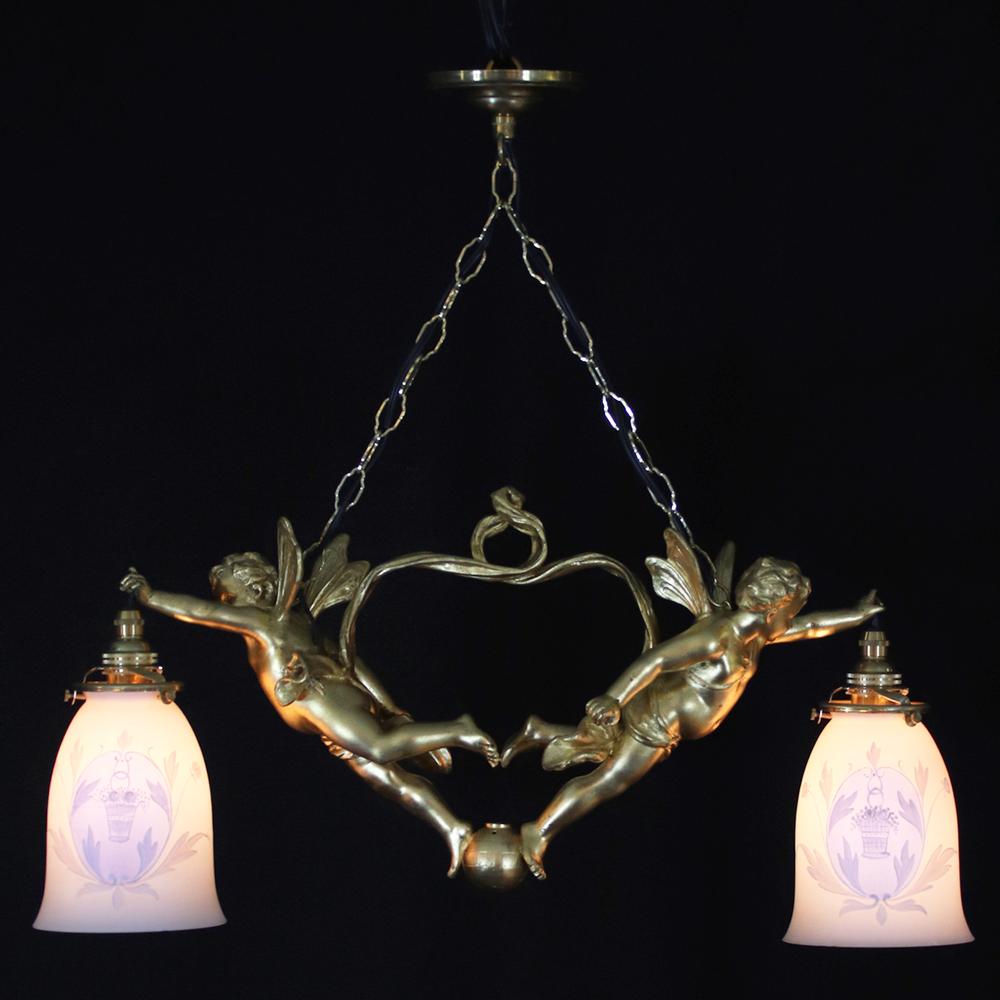 二十世紀初頭 ミルクガラス&本金仕上げブロンズ 2灯 フィギュラルシャンデリア