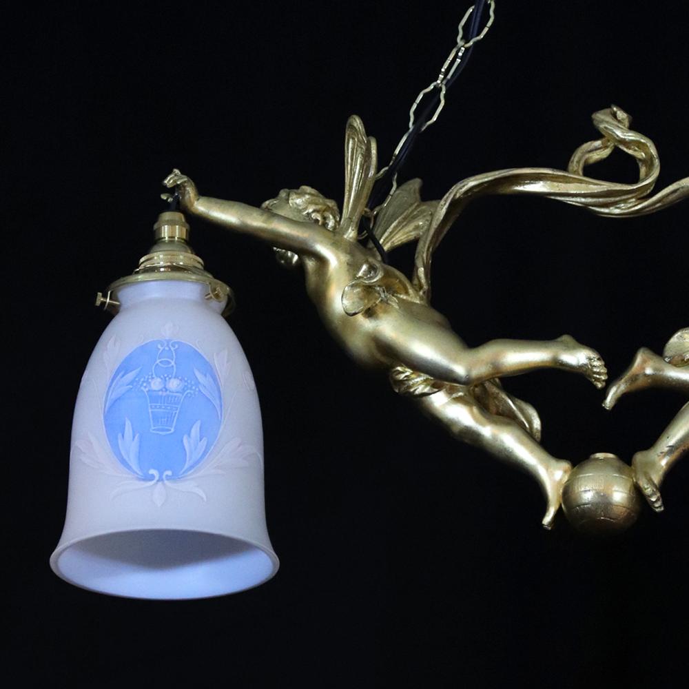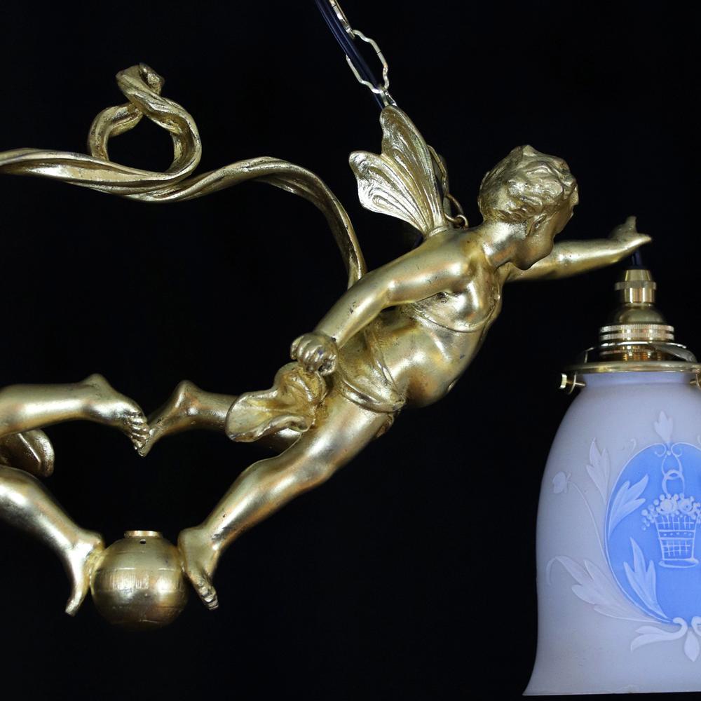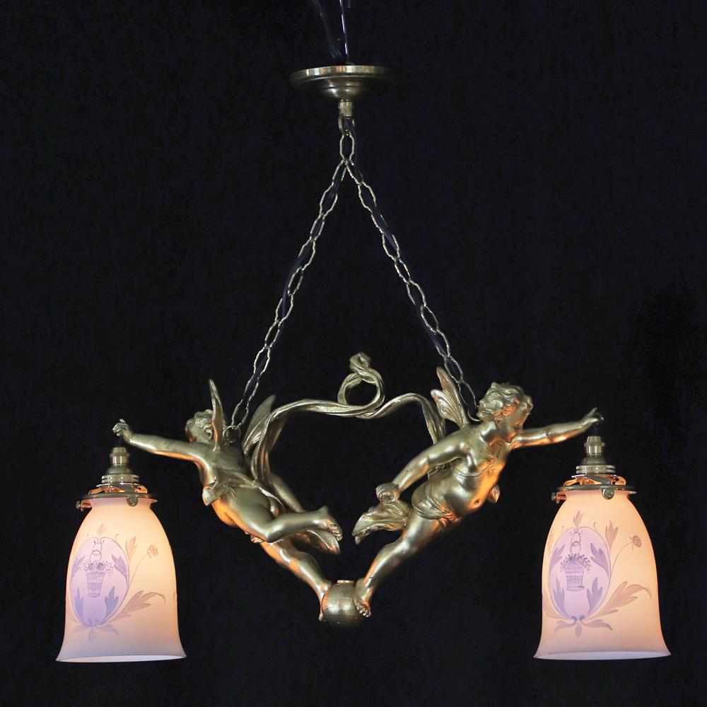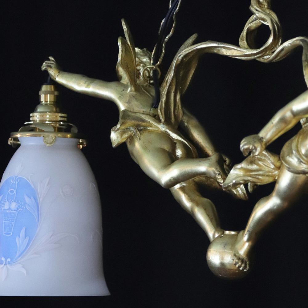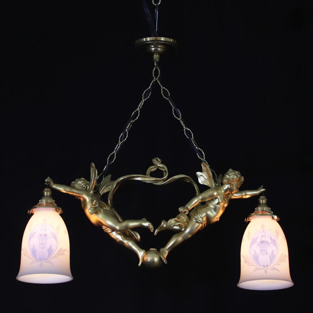 二十世紀初頭 ミルクガラス&本金仕上げブロンズ 2灯 フィギュラルシャンデリア