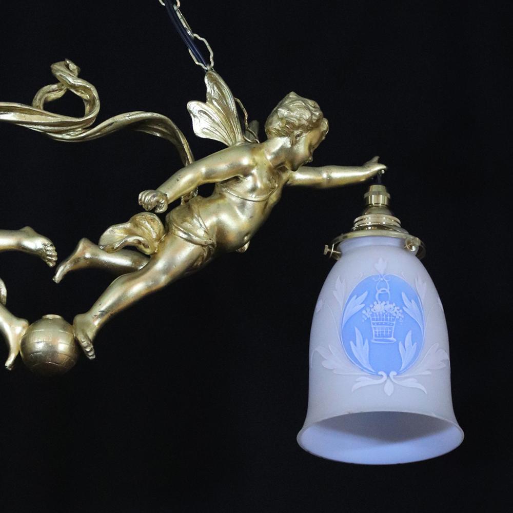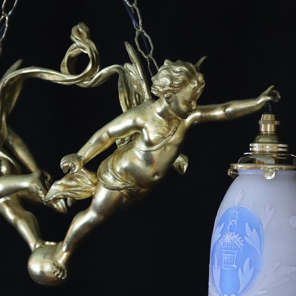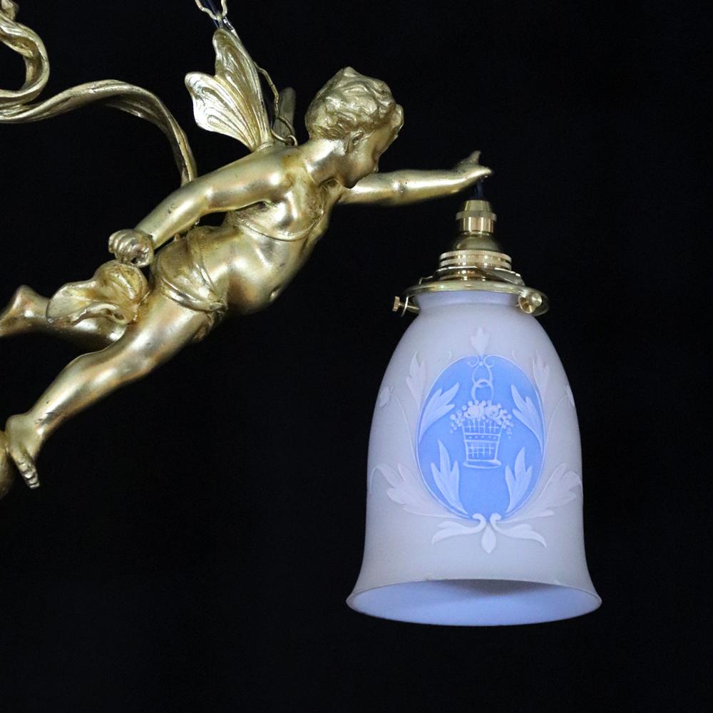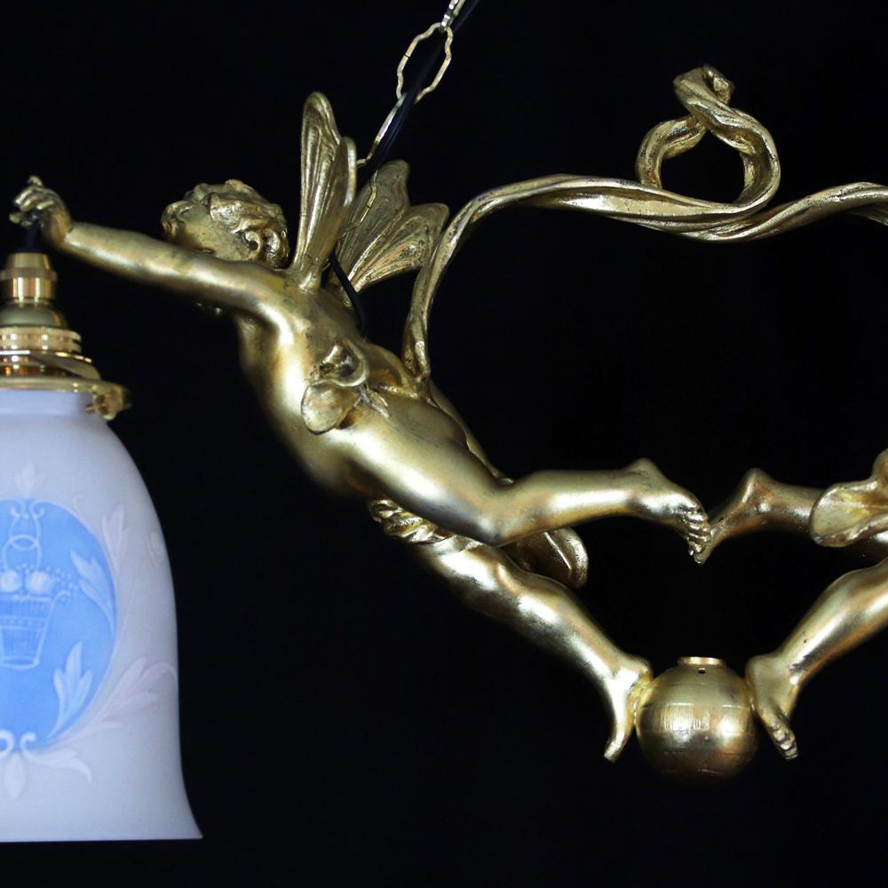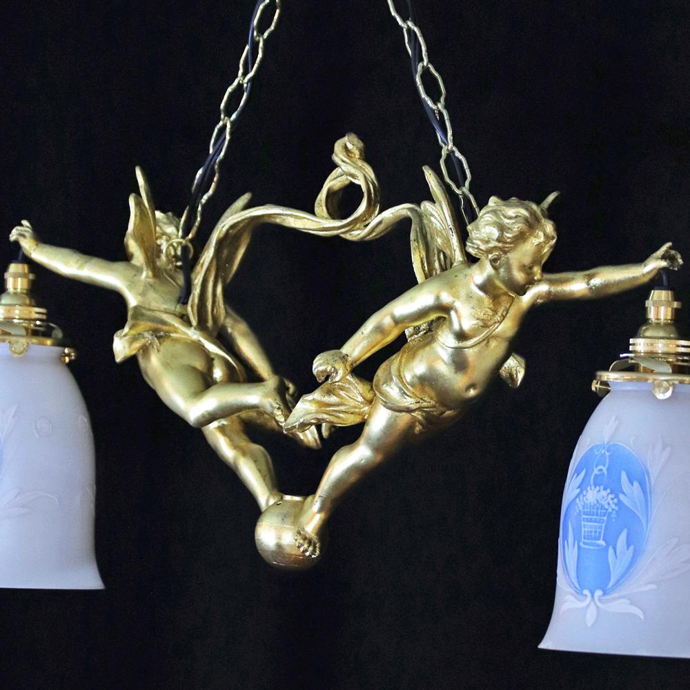 二十世紀初頭 ミルクガラス&本金仕上げブロンズ 2灯 フィギュラルシャンデリア