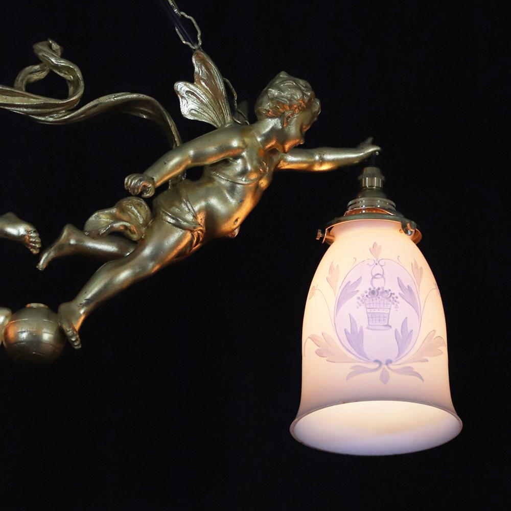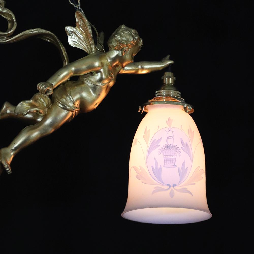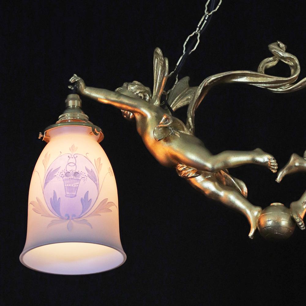 背中合わせの小妖精がれぞれが掲げ持つシェードはミルクガラス製。