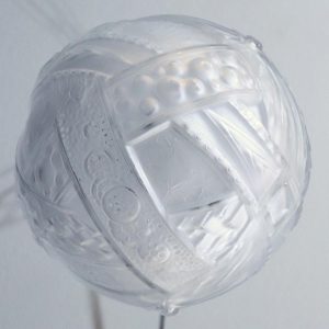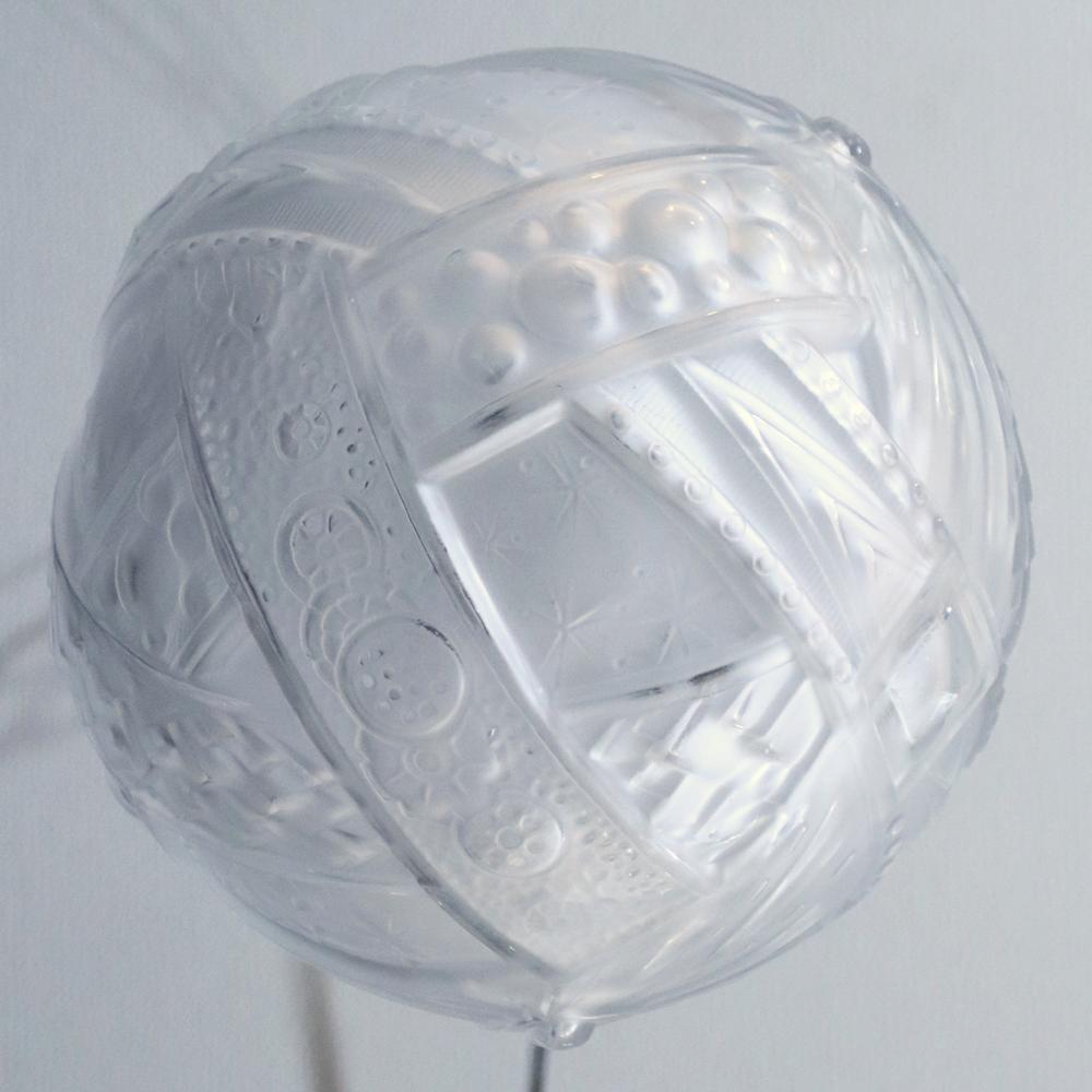 巻き詰められたバンド(帯)で覆われた球形のガラスシェード表面には意匠化された植物文あるいは光や水などの動的なモチーフが描かれています。