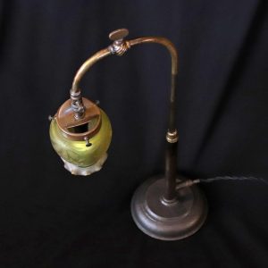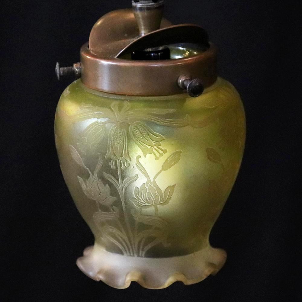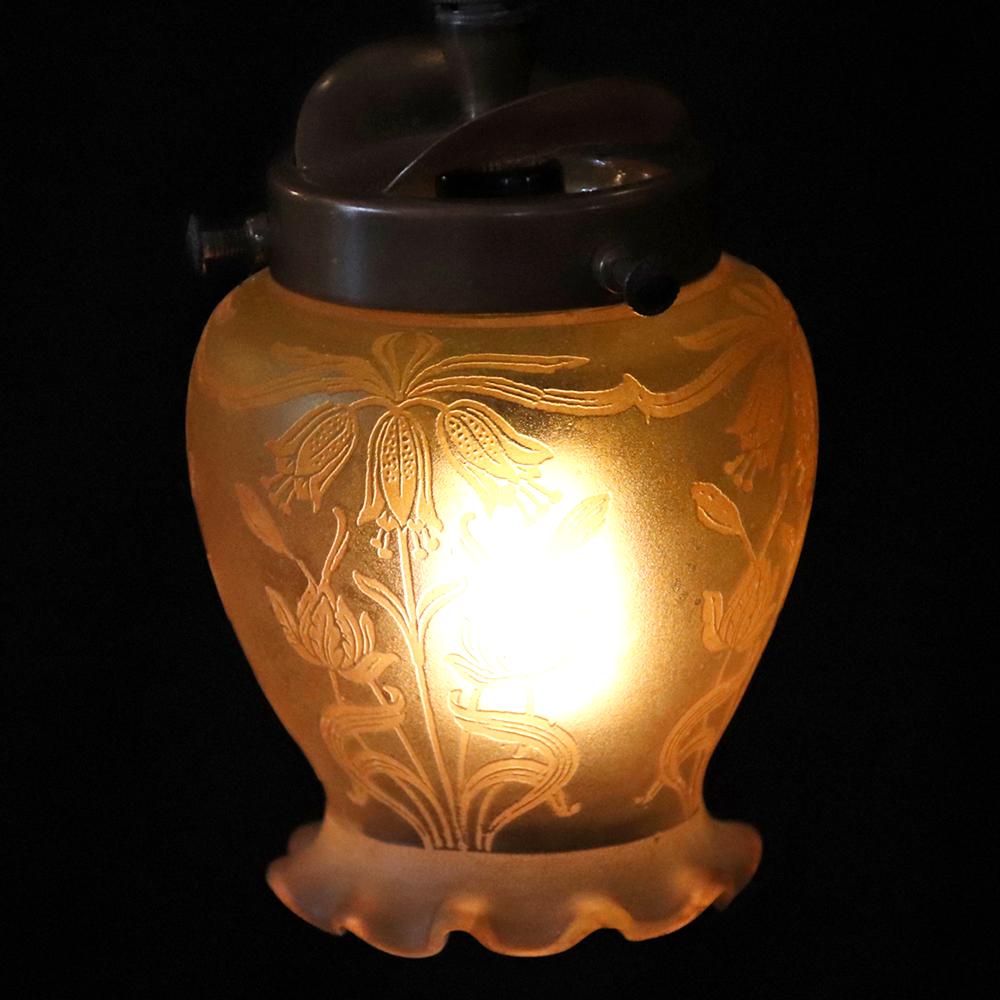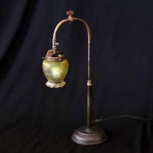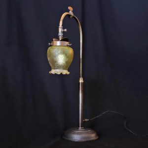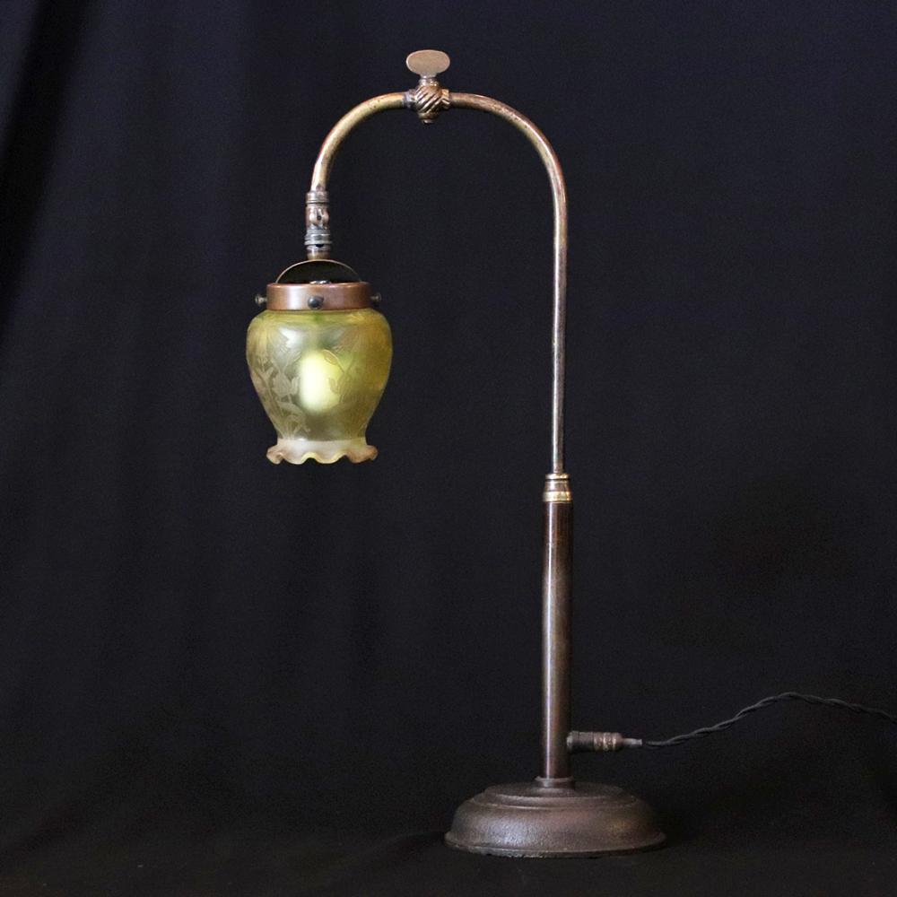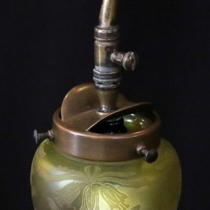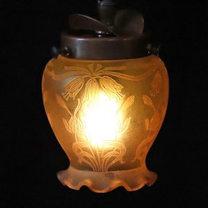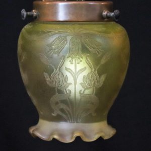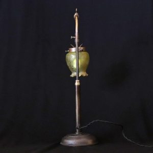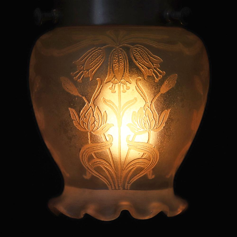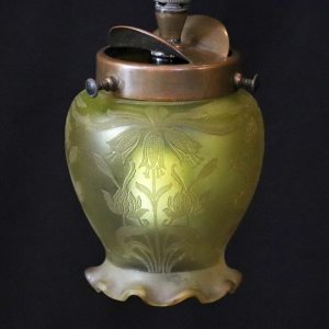 シェードは上品なグリーンガラスに絵柄を刻んだアール・ヌーボーデザインの品物。