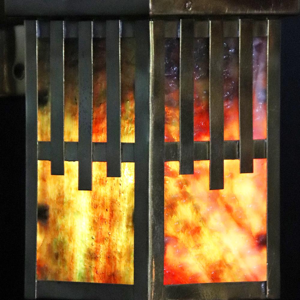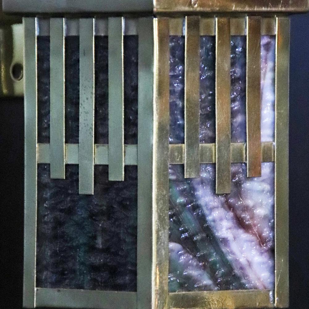 フレームはブラス(真鍮)製で、シェードは色鮮やかなスラグガラス。